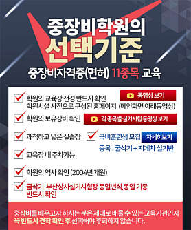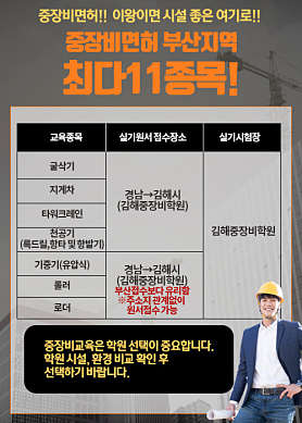 오늘의 배움, 내일의 시작! 최고의 시설로 산업체 현장 중심의 우수한 인재 양성, 훈련생 중심의 교육을 지향하는 부원중장비학원 본 학원은 상시기능사(지게차, 굴착기(굴삭기)) 및 정기기능사(천장크레인, 타워크레인, 컨테이너크레인(T/C), 기중기, 로더, 롤러, 불도저 등) 중장비운전과 관련된 모든 국가기술자격증 취득 할 수 있는 전국 최대 자체시험장 보유 교육기관입니다. 필기교육부터 실기교육, 시험까지 원스톱! 모두 한곳에서 편리하게 자격증 취득하시길 바랍니다. (※연중무휴) 감사합니다. 교육과정안내 1.일반과정 (1)소형건설기계면허증취득 -3톤미만:지게차, 굴삭기, 로더, 타워크레인(무인타워크레인) -5톤미만:로더, 불도저, 천공기 -그외:쇄석기(크라샤), 공기압축기(콤프레샤), 준설선 (2)국가기술자격증 취득 -상시:지게차, 굴삭기운전기능사 -정기:천장크레인,타워크레인, 컨테이너크레인(T/C), 유압식기중기 천공기(항타및항발기, 록드릴), 로더, 롤러, 불도저 등 운전기능사 2.무료국비지원과정(내일배움카드 프로그램) 지게차, 굴삭기, 기중기(유압식크레인) 등