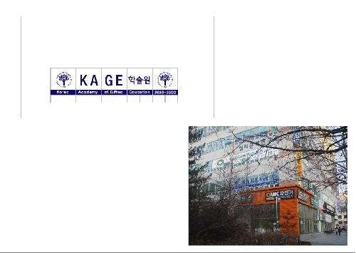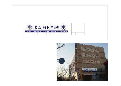 1989년에 설립되어 오늘에 이르기까지 영재교육의 외길을 걸어 온, kage영재교육학술원은 만 30개월부터 중학교 2학년까지 단계별 능력별로 수업하고 있습니다. 그리고 주제중심,프로젝트 중심의 수업으로 창의성과 논리성은 물론 자기주도적인 학습능력을 키워줍니다. 수업을 원할경우, 입학검사에서 상위 3퍼센트 내에 속한 아동에 한해 입학이 가능합니다.