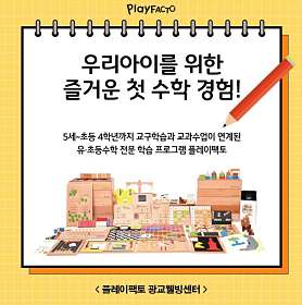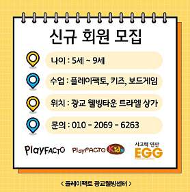 플레이팩토 광교웰빙센터 대상 연령 : 5-9세 수업시간 : 월~금 1~7pm 커리큘럼 1. 플레이팩토 키즈 (5세) 2. 플레이팩토 (6세-초3) 문의 : 010-2069-6263 위치 : 광교 웰빙타운 (이의동 1229) 트라엘아파트 상가 2F
