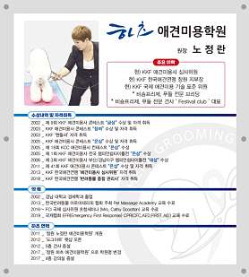 안녕하십니까. 하츠 애견미용학원입니다. 현재 우리는 애견 인구가 1,000만에 달하는 시대에 살고 있습니다. 단순한 애견이 아닌 반려견과 함께 살고 있는 시대입니다. 애견 인구는 계속 늘어나고 있으며 우리나라의 PET산업은 이제 걸음마 단계를 지나 정착 발전하는 시기에 접어 들었습니다. 본원은 제가 십수년간 배운 지식과 노하우를 알려드리기 위해 본원을 설립하게 되었습니다. 취업, 창업뿐 아니라 진학에 이르기까지 최고의 교육을 약속드리며 나아가 계속 발전하고있는 애견 산업을 이끌어가는 인재가 될 수 있도록 본원이 도와드리겠습니다.