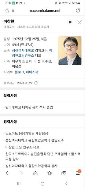 1. 대표 약력 현) 성신여자대학교 융합보안공학과 겸임교수 현) 이창현코딩연구소 대표 현) 한국소프트웨어기술진흥협회 취업자 양성 과정 전임강사 현) 숭실원격평생교육원 운영 교수 현) IT 프로그래밍 작가 및 번역가 - 21여년간 다양한 기업과 직군에서 SW 개발자 및 아키텍트로 활동. - 나혼자 파이썬 외 11권의 프로그래밍 저서 및 번역서 다수 집필 - SK 하이닉스 재직자 알고리즘 출제 위원 - 위클리피플 - 코딩 전문가 표지 모델 - 아리랑 TV - 소프트웨어 시장 방송 인터뷰 - 직업교육방송 - 소프트웨어 전문가 방송 인터뷰 2. 이창현코딩연구소 소개 우리나라는 아직 코딩 교육에 대한 준비가 잘 되어 있지 않습니다. 코딩 교육 전문가가 거의 없다고 해도 과언이 아닙니다. 소프트웨어에 대해 개발자 양성에 대해 경험과 지식을 갖춘 전문가를 찾기 어렵습니다. 그럼에도 불구하고 오히려 잘못된 코딩 교육 정보로 인해 많은 학생들이 혼란을 겪고 있습니다. 코딩은 결코 암기를 하는 학문이 아닙니다. 스스로 자기주도학습을 하고 스스로 답을 찾아가는 학습을 해야 합니다. 이러한 형식의 학습이나 자세에 대해 생각조차 안하고 있다면 코딩을 하지 마십시요. 제발 우리나라 공교육의 국, 영, 수처럼 공부하지 마세요. 코딩에 대한 마인드와 자세, 학습까지 제대로 배워보고 싶다면 이창현코딩연구소에서 시작하세요. 3. 교육 대상 - 고등학교 내신 향상을 위한 특성화 고등학교 학생 - 컴퓨터공학과, 소프트웨어공학과 등의 진학을 위한 일반 고등학교 학생 - IT 개발자 취업 준비생 4. 교육 과목(상황에 따라 과목은 더 늘어날 수 있습니다.) - C언어 - 파이썬 - 프론트엔드(HTML/CSS/자바스크립트) - 백엔드(모던자바스크립트/Node.js) 5. 교육 방식 교재는 모두 저자의 저서를 기반으로 하고, 100% 온라인 교육(구글밋 or 줌)으로 진행됩니다. (이동 시간 절감, 교통비 절감) 6. 문의 031-300-3953 jamsuham75@naver.com