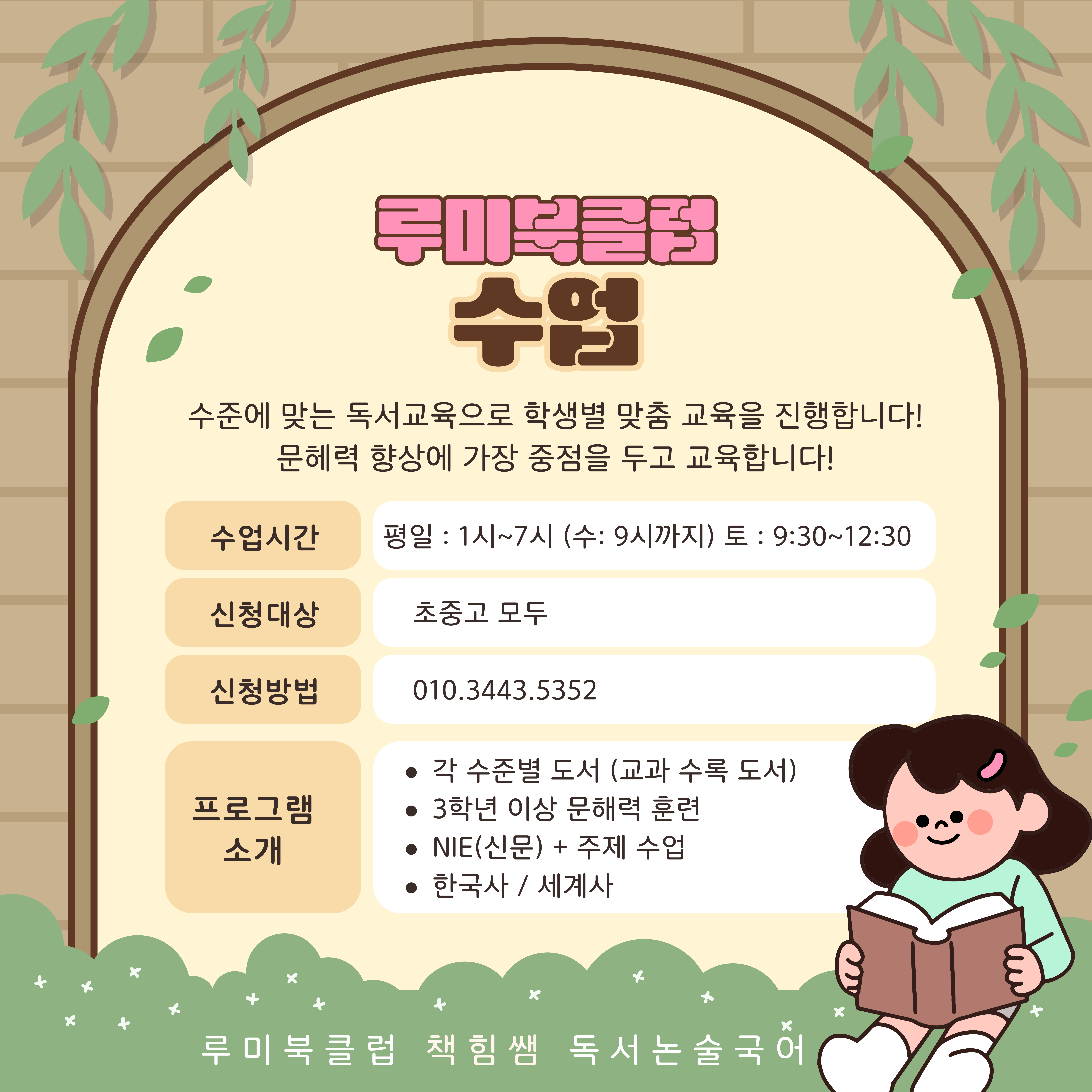 “결과를 만드는 독서, 루미북클럽은 다르게 합니다.” 단순히 책만 읽는 수업이 아닙니다. 아이의 현재 수준을 정확히 진단하고, 모르는 단어를 스스로 찾아 이해하며, 틀린 문제를 끝까지 분석하는 힘을 기릅니다. 읽기 → 이해 → 표현까지 한 번에 연결되는 진짜 독서 수업 아이마다 다른 속도와 수준에 맞춰 기초부터 탄탄하게, 실력은 확실하게 끌어올립니다. 📌 독서 + 국어 + 사고력까지 한 번에 📌 자기주도 학습 습관 형성 📌 재원생·비재원생 체험 가능