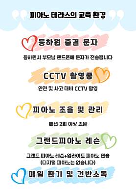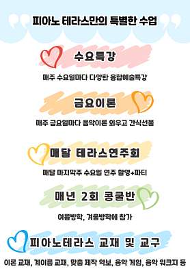 피아노테라스 유치부, 초중고 학생, 성인 개인레슨 상담전화 0 1 0 - 5 8 4 5 - 2 0 8 2 아이들의 소중한 수업시간을 위해 전화로 상담 예약 후 방문 부탁드립니다