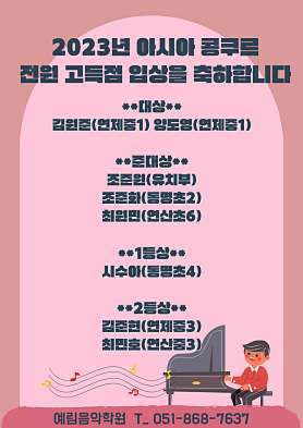 안녕하세요. 예림 음악 학원입니다. 저희 음악 학원은 30년 이상 경력을 자랑하는 피아노 전공 원장이 연제구에서만 15년 넘도록 홍보 없이 실력으로 입소문을 타 지금까지 학생들을 가르치고 있는 학원입니다. 코로나 기간을 제외하고 매년 콩쿠르 등 다양한 대회 입상을 하고 있으면 올해 2023년 아시아 콩쿠르에서 대상 2명 준대상 3명 1등 1명 2등 2명 등 전원 고득점 입상을 하였고 유치부부터 초중고 성인 취미반,주말반까지 운영하고 있습니다. 다른 학원에서는 얻기 힘든 피아노 전공 베테랑 원장 선생님만의 독특한 노하우와 실력으로 우수한 피아노 인재 양성에 목표를 두고 있습니다. 상담 문의 010 2071 3380