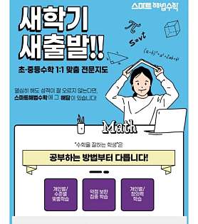 초중등 전문 스마트해법수학 목동아델리체점 AI 학습 시스템의 완벽 커리큘럼과 단계별 1:1 맞춤 문제로 수학실력을 탄탄하게! 10년 입시수학 전문 경력의 원장 밀착관리 스마트한 수학 공부 방법 제공 및 사고력 확장 목동 강남 대치동 중고등 수학 입시 강의 미국 텍사스 공대 수석 졸업