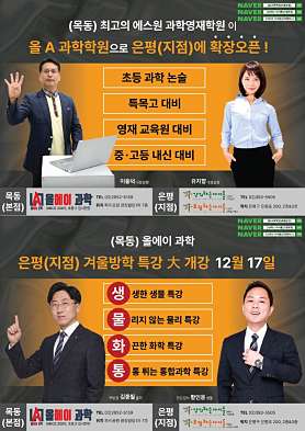 초중고 과학전문 올A 과학학원 세특 : 과학논술~탐구보고서 개인별 작성지도 초등 : 과학논술(선생님도 놀란과학뒤집기시리즈) 및 중등 브릿지과정 대학부설 및 과고, 교육청 영재교육원대비 병행 중등 : 과학선행+ 하이탑 화학1,2+물리1,2 심화+생물1,2 심화 및 특목고, 영과고대비 고등 : 고1통합과학+ 수능대비 1,2등급 컷 완성 및 유지 / 의치한약수전문 이홍덕원장(펭귄선생님) 현.올A과학학원 원장~24년도 은평지점오픈 목동에서 2002년도부터 과학수업시작~현재까지 구.에스원과학영재학원 원장~23년도 확장이전 하버드대2명/MIT2명/ SKY의대포함100명이상 진학실적/의치한약수및영과고/하나고/전사고전문 김종필물리(부원장) 황인용생물(은평지점팀장) 신상일생물선생님