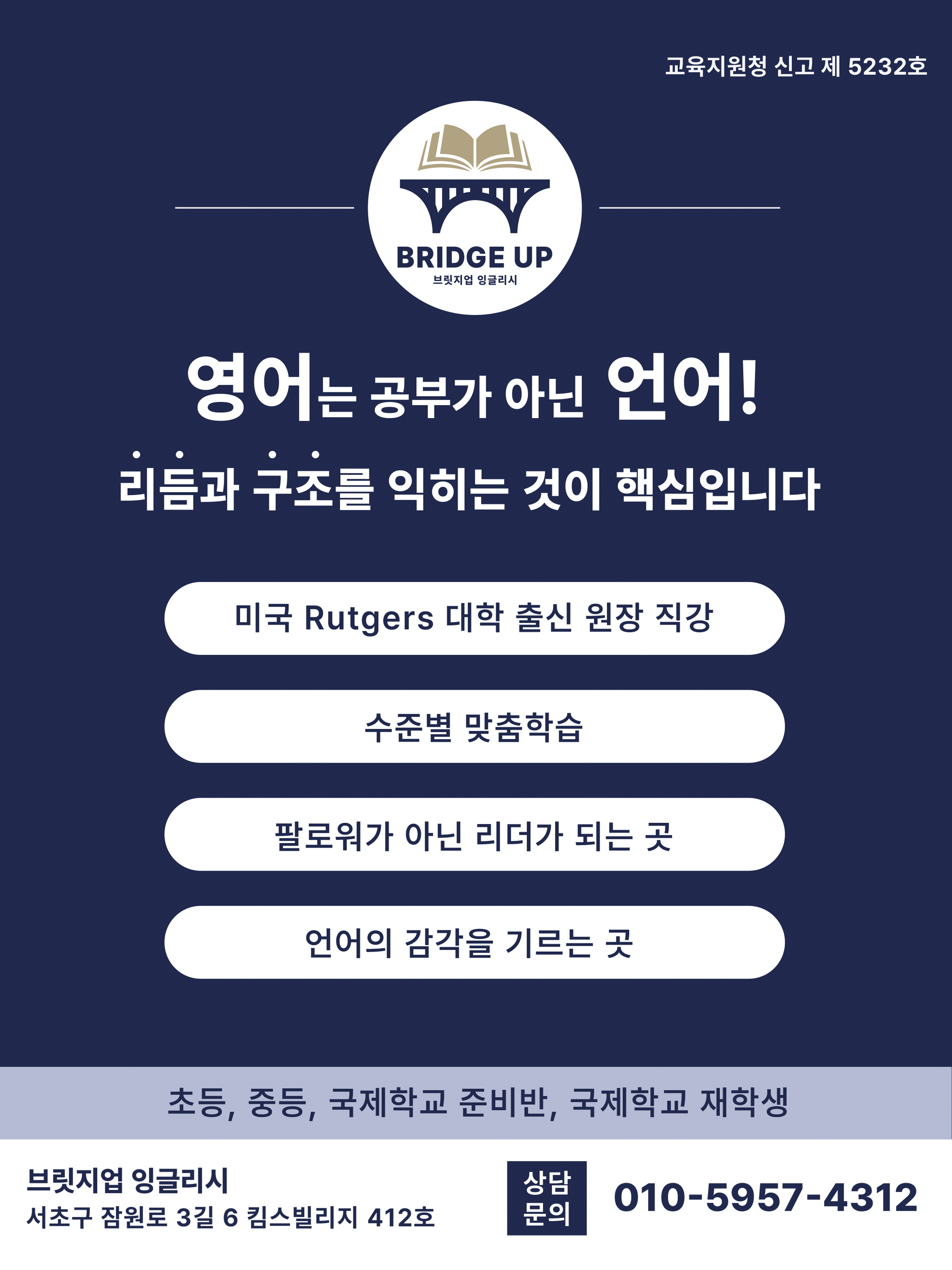 브릿지업 잉글리시는 각 학생의 학습 속도와 스타일을 깊이 이해하며, 영어 실력을 획기적으로 끌어올릴 수 있는 소수정예 학습 환경을 제공합니다.