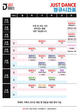 K-POP 방송댄스 ( 주중반 / 주말반 / 키즈반 / 성인반 ) 스트릿댄스 (왁킹 / 힙합댄스 / 팝핑 / 락킹 등 .. ) 취미반 / 기초반 방송 댄스 / 스트릿댄스 교육 문 의 : 051.552.9733 카카오톡 : JUSTDANCE1 주소 : 부산광역시 동래구 온천2동 419-12 화성빌딩 5층 JUST DANCE 댄스학원