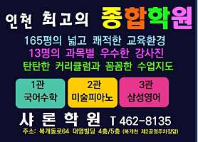 삼성영어 최우수교실로 선정된 인천 최고의 종합학원입니다 쾌적한 교육환경과 탁탄한 커리큘럼으로 15명의 우수한 강사진이 최선을 다해 원생들의 실력을 키우고 있습니다 여기저기 이동하지않고 유치부부터 고등과정까지 한 곳에서 다양한 교육을 최고의 강사에게 전문적으로 교육 받을 수 있습니다 ( 1관 국어수학 2관 미술피아노 3관 삼성영어 )