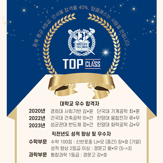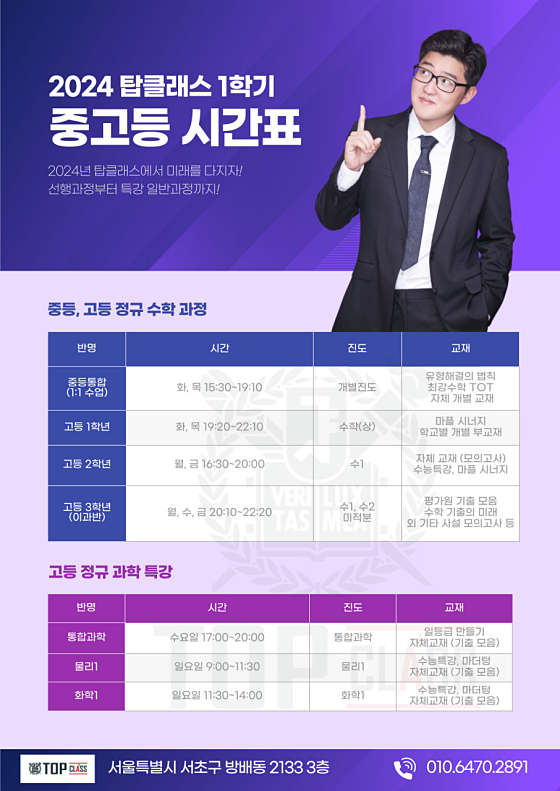영재학교, 서울대 출신 원장 직강 탑클래스 수학, 과학 학원입니다. 고3은 정시위주, 타 학년은 현행 내신 위주로 진행됩니다. (재원생 - 경문/서초/서울/동작/서문여고 재학) 2024년 1학기 개설 과목 - 중등 수학 (개별식 진행) - 고등 1학년 (수학 (상)) - 고등 2학년 (수1, 확률과 통계) - 고등 3학년 (수1, 수2, 미적분 / 수능 대비) - 통합 과학, 물리1, 화학1