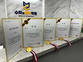 형제할인 진행중!! 2023년 하반기 KMA 수학 학력 평가 우수 학원+ 우수 지도자 상 선정!! 학원에서는 많이 틀려봐야 한다. 는 소신으로 학원을 운영하고 있습니다. 타협하지 않는 수학의 메카 학원 수성구 학군에서 성공 경험으로 우리들의 아이를 가르치겠습니다. 매일매일 진행되는 일일 테스트로 인해 학생들의 성취도 향상! 올바른 노트 관리 및 서술형 대비 단점 파악 및 보완점 제시 가능! 학부모와 학생을 위한 학원 전용 어플을 통해 등하원 알림과 학생 성적 및 진도 사항 과제 확인 및 담당 선생님과의 소통 가능! 개별 성취도에 맞는 과제 및 수업 가능! 학원내 스터디룸 재원생은 무료이용 가능! 입학상담은 전화 상담 및 방문 상담으로 가능 합니다. 자세한 내용은 블로그 참조 해주세요 ^^