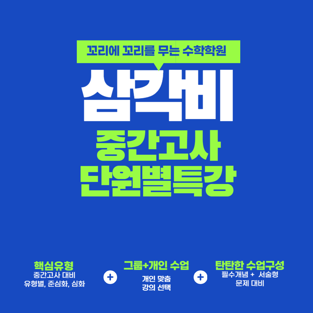 신월성 학원가에 위치한 수학전문학원 #원장직강 -정규반 기준 매 수업은 그룹수업+개인수업으로 이루어짐 -이전 수업시간에 배운 내용 리뷰 후 다음수업 진행 을 철칙으로 함(복습 중요성 강조) -학교 내신에 맞춘 정규수업 -오답노트(for 유사개념문제, 쌍둥이문제 해결) -재능을 뛰어넘는 학습하는 습관을 길러야함을 강조 수업관련문의사항은 053-637-6848 010-9236-6848 언제든지 연락주세요:)