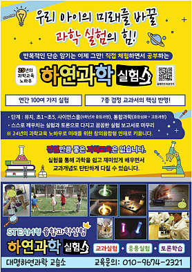 [신고 제 5728호] 직접 실험하며 배우는 올바른 과학교육 대명하연과학교습소 -유치원(7세)부터 초등6(예비중등과정)까지 -소그룹수업진행 -주1회 60분수업, 1회2개실험 (실험+교재+실험보고서) -교과실험+응용실험으로 1년 100여가지 실험 -과학교육전공선생님